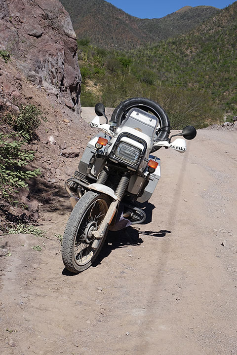 | The country side was spectacular, but the road remained a challenge, Art had just fallen after an awkward stall mid corner, where this Arroyo (Gully Stream) crossed the road in the and had played havoc with the surface. We took a break ,so I wander up it thinking how this would totally destroy the road in full flow during the Rainy Season |