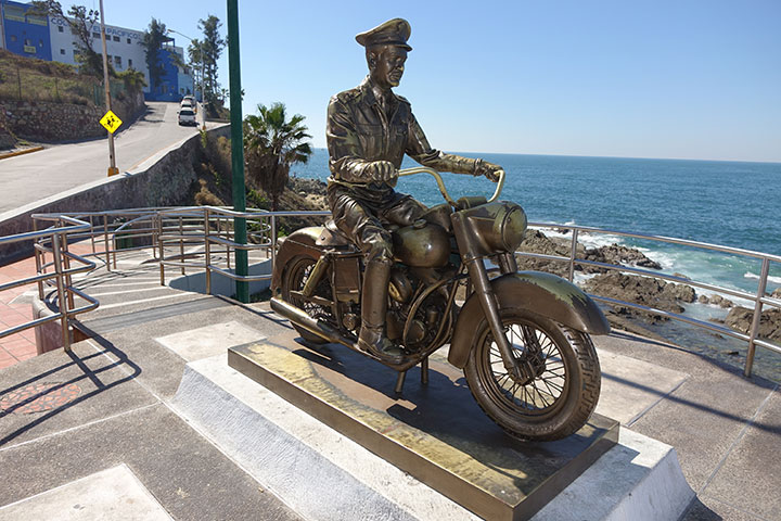 | The next morning we ate a hardy breakfast in the restaurant attached to the Hotel. Then leaving Rodeo fairly early continuing South, the roads were good, lightly trafficked and only interrupted by well managed roadworks that barely impeded our progress, reaching the outskirts of the city of Durango we used the ring road to connect to the Main Highway to Mazatlán, initially it is quite straight as it undulates across rolling hills, low on gas and hungry we pull off and re-fuel both man and machine, I also find some painkillers, which makes the rest of the days ride even better. At El Salto the road turns into a spectacular ride out of the Sierra Madre, around beautiful sweeping bends, passing through 100's of tunnels and over almost as many bridges, but it comes at a price we have to pay 256 Paso's ($20 US) in tolls, we catch sight of the Old "Libre" (Free) Highway on occasion that is supposed to be a fantastic ride too, but it is many miles longer, with many more twists and takes nearly twice as long to traverse. Unfortunately on the Toll road there was nowhere to pull over to take photos, even though I didn't want to interrupt such a fantastic ride it would have been nice to have a record of the spectacular visas as we glided down either side of these massive canyons. We had dropped from 6,500+ feet (2,000+m) to Sea Level and arrive a Mazatlán and to what feels like a heatwave to us. But not before Art asks for directions from a couple in a Ford Explorer as we wait at a set of traffic lights, once again we end up being escorted to our destination, the venerable Hotel Belmar, a favourite with the overland traveler crowd, because it's cheap and a great location even if it's a bit rough around edges... |